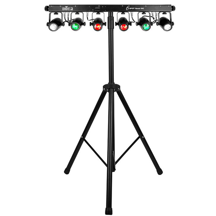 Chauvet 6 Spot Quad IRC Lighting Effect and get a wide spread of changing colours that will really give your party or disco a professional light show at a very affordable price. The lighting unit features 6 individually adjustable lights, all mounted upon a sturdy tripod. Very simple to use, just plug into the mains and watch it go! Shine onto a wall, ceiling, or dance floor.. the 6 Spots will give total coverage over a large area. Works great if used in conjunction with a smoke machine too!