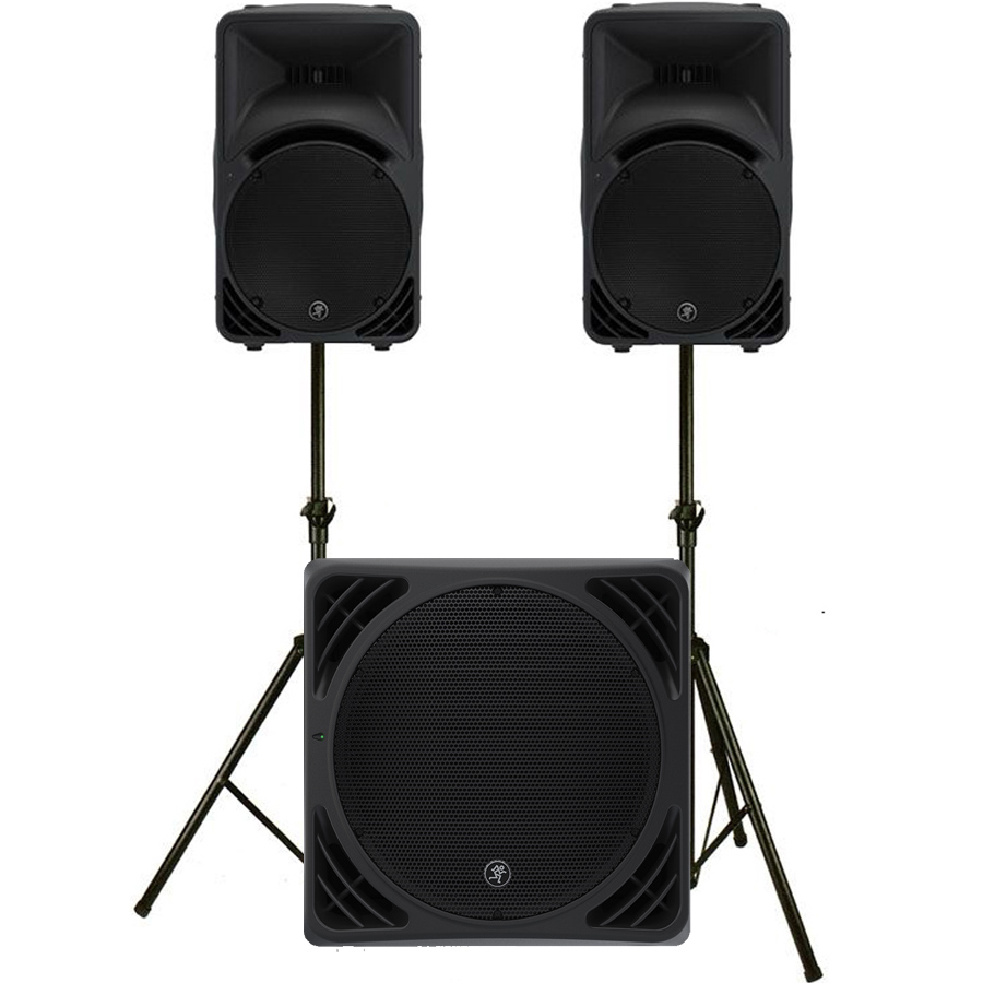 Each Mackie SRM450 V3 is a self contained powered PA speaker, housing a 12" Mid/Low driver, and a 1.4" titanium domed high frequency horn, whilst the Single Mackie SRM1550 Sub bass woofer gives out 600 watts RMS of pure low end bass power, really enhancing the pair of top cabs, making it great for live bands or discos in larger venues where more volume is needed. This versatile sound system that can be used in a wide variety of settings -