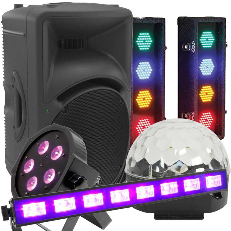 The sound system is a single Mackie SRM450 Powered PA speaker, giving up to 500 watts output via its 12" speaker and 1.4" titanium dome driver. Simple to set up, we provide the cables so you can connect your mp3 player (ipod, phone, etc) or CD player and use your own playlist made up of favourite songs. Just switch it on and adjust the volume and your party will be off to a flying start! However, a really good kids disco needs lights, and plenty of them, so we have included some of our most popular effects -