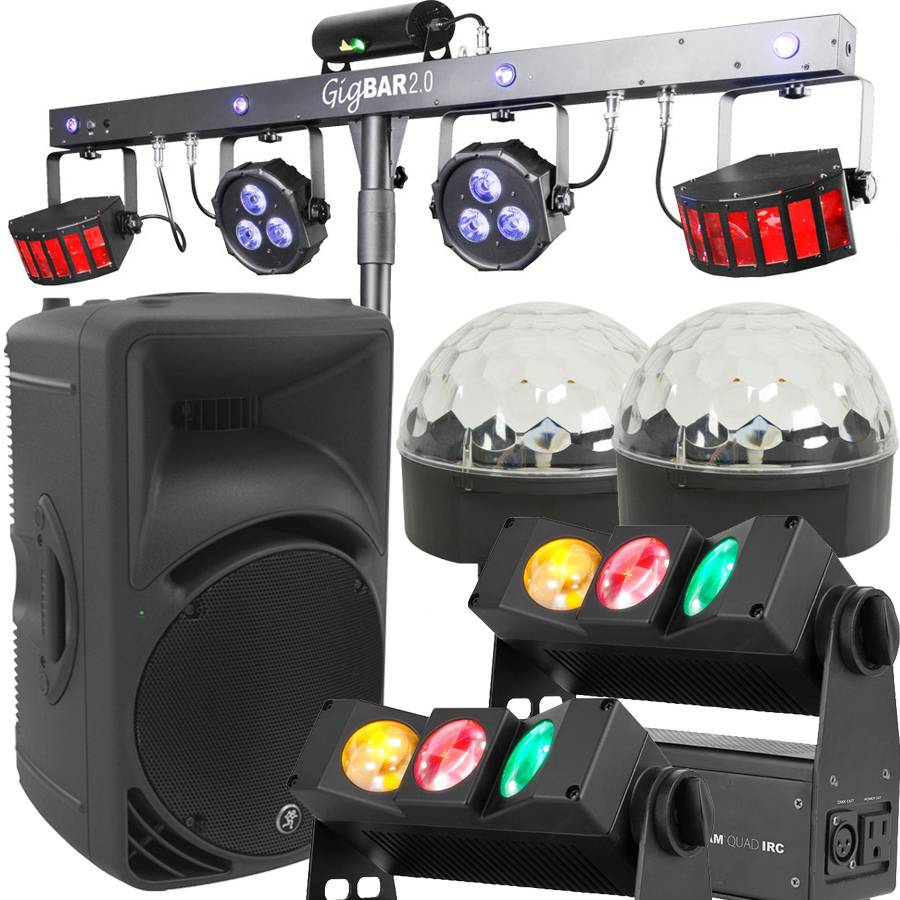 The sound system is a single Mackie SRM450 Powered PA speaker, giving up to 500 watts output via its 12" speaker and 1.4" titanium dome driver. Simple to set up, we provide the cables so you can connect your mp3 player (ipod, phone, etc) or CD player and use your own playlist made up of favourite songs. Just switch it on and adjust the volume and your party will be off to a flying start! However, a really good disco needs lights, and plenty of them, so we have included some of our most popular effects -