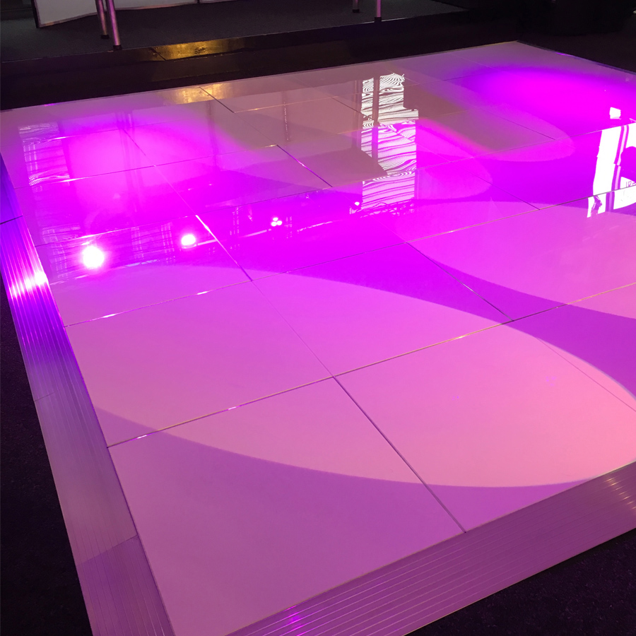 Unlike many of the cheaper imported floors, ours is made from heavy duty solid cast white gloss acrylic, which resists scuffs and scratches far better, giving a smarter looking dance floor. The gloss white finish allows any disco lighting to be reflected, adding to the overall effect. Each dancefloor features a 5" wide ramped aluminium trim edging, clearly and safely defining the boundary of the floor. Your guests will love dancing the night away on this slightly sprung professional dance floor!